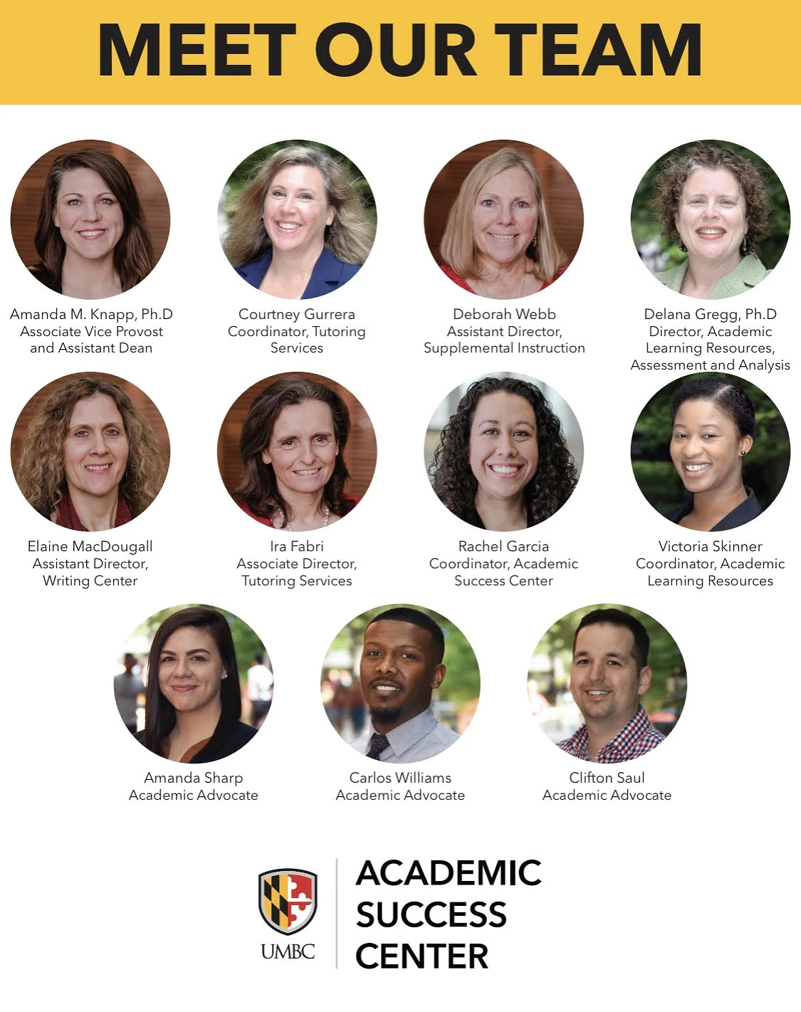 Through a coordinated approach and an unwavering commitment to student success, the Academic Success Center serves as a one-stop hub for a variety of services including Academic Policy support, Academic Learning Resources, and Academic Advocacy. If your student is unsure which service(s) may benefit them, please encourage them to contact the Academic Success Center by email (academicsuccess@umbc.edu) or by phone at 410.455.2444 and our team will connect them with the service(s) most applicable to their needs.